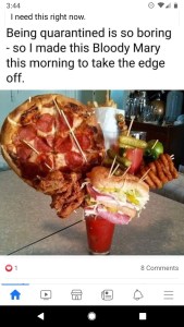 We’re All On Board: Yesterday (Barb’s idea) I set up a group text with all the Bigelow family (and Capogna’s and Fyvie’s). No sooner had I sent it out then Gina memes a Bloody Mary with pizza, bacon, French fries and who knows what else. Marietta says she’s Zooming with Cathy, and early birthday wishes are sent to Kyle. I guess they liked it. Unfortunately I didn’t have the phone numbers for Nick, Boo or Ross, so I had to add them in. Couldn’t do it so had to start all over. And now I find out that all the texts are flooding Nick’s email. Great tech requires a great tech mind. I failed.