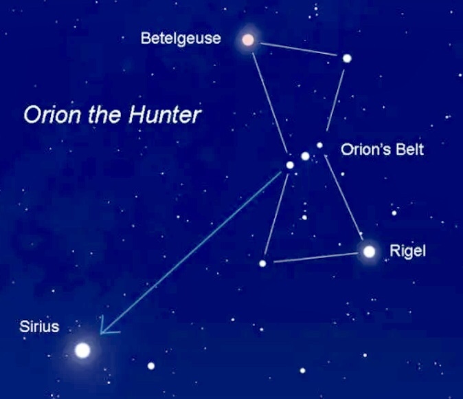 When I realized this, I wanted to learn more. I wanted to get to know the neighborhood. Who are these stars? I have a terrible memory, so I started out slowly. Sure, I knew Betelgeuse. Next: at the lower right, Rigel. Swipe down and left from Orion’s Belt to find Sirius, one of the night’s brightest stars.